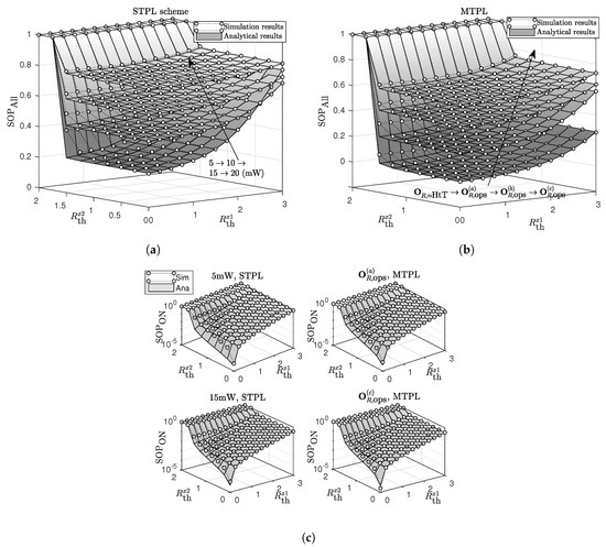 In Figure 3, we show the effects of required secrecy rates, and , on the SOP. and show increasing trends with the increases in and/or . It is easy to show that bits/s/Hz. The analytical results match well with the simulation results except for the case that gets close to and gets relatively low values. At higher values of , i.e., 15 mW and 20 mW, the accuracy of the analytical results is improved significantly. The reason is the approximations at (13), (14) and (A13) become less accurate when is low and approximates , respectively. It is seen in Figure 3a that there is a change in the effective values of , which yields the lowest for the STPL. With the increase in , R chooses higher transmit-power levels to achieve the lowest . This disadvantage is overcome by the MTPL. By sending information at diverse transmits powers, the MTPL shows its superiority in improving the secrecy outage performance. The HtT scheme achieves the best performance and the analytical results for the SaT scheme using approximate well with the simulation results for the HtT scheme.