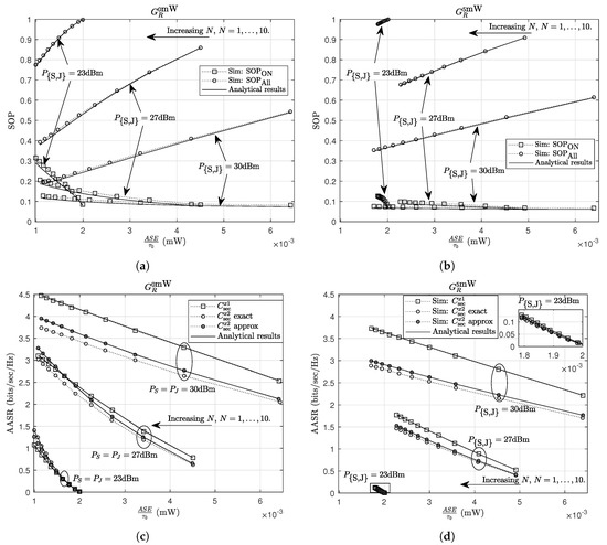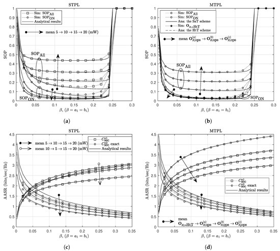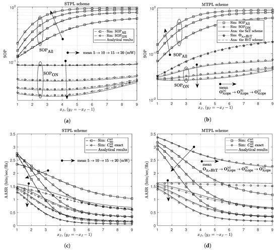 In this section, we present numerical results to validate the analytical expressions presented in Section 3. Unless otherwise specified, we set dBm, , bits/sec/Hz, bits/sec/Hz, mW, and (We use the parameters of the NLEH model given in [27]). We assume that for the two-user case; hence, we do not examine the effects of on the AASR results. The coordinates (in meters) in the two-dimensional plane of and J (as illustrated in Figure 1a) are set at and , respectively. We consider the SaT scheme in two scenarios, MTPL and STPL. The STPL is a simpler case of the MTPL where R supports only one transmit-power level. For the MTPL, we examined four OPSs given as mW, mW, mW and mW. For the STPL, the supported transmit-power level of R is examined in four cases, i.e., 5 mW, 10 mW, 15 mW, and 20 mW. Moreover, we consider the case that R uses the HtT scheme to assist the communication and show that the SaT scheme using approximates well the HtT scheme.