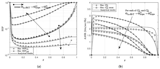 The effect of θ on (a) the SOP and (b) the AASR. Other parameters: PS = PJ = 27 dBm, a1 = b1 = 0.1, (, ) = (1, 0.6) bits/sec/Hz.