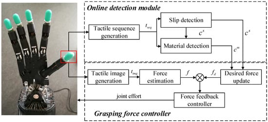 The goal of grasping force control is to maintain contact between the robotic hand and the grasped object to avoid slippage. A slip occurs when the grasping force applied by the robotic hand is insufficient. It may be caused by the slipperiness of the object or an external disturbance. Hence, online slip detection is of critical importance for robots to stabilize grasped objects. Once slippage is detected, the robotic hand needs to adjust its contact configuration. Tactile information has been used as the primary sensory modality for slip detection [2]. Most of the previous works formulated slip detection as a classification problem, in which a classifier was built with an SVM [3] or random forest [4]. Those works typically require designing features manually from tactile data for classification. To achieve a better detection performance, more recent works applied deep learning techniques for slip detection [5,6,7]. In those works, features were automatically learned from tactile data for classification. In addition, recognizing the object’s physical properties (e.g., material) is also critical for object stabilization. Tiest et al. [8] demonstrated that the main mechanism for modulation of grip force in the early phase of grasping is the real-time sensation of the material (texture) of an object. Information about object material could help robotic hands to know how to interact with them in advance. Although there has been some previous work [9,10,11] that implemented material detection, few works have incorporated material detection into the grasping force controller. In general, there are two main differences compared with the state-of-the-art methods: (1) In contrast to previous methods that consider slip and material detection separately. This work trains an online detection module to identify contact events and material simultaneously. (2) An online detection module is designed based on a deep neural network for slip and material detection. It is not necessary to design features manually for slip or material detection.