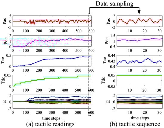 Example of a tactile sequence sampled from tactile readings. (a) tactile readings produced by the BioTac sensor; (b) tactile sequence with a dimension of sampled from tactile readings. The window size is set to 32 and the number of tactile features is 23.