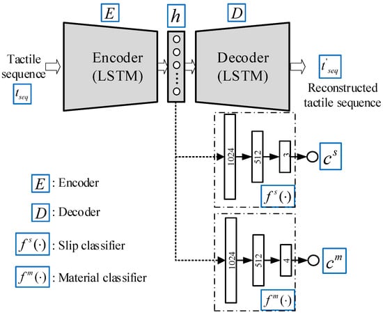 An LSTM-based encoder–decoder is firstly employed to learn the low-dimensional latent representation of a tactile sequence. The encoder–decoder consists of three parts: an encoder E, a latent representation h, and a decoder D. The encoder takes the tactile sequence as input and outputs the latent representation h which is a feature vector with a fixed length. The decoder takes the latent representation h as input and reconstructs the inputted tactile sequence. Because the tactile sequence is a time-series data, we take advantage of LSTM to capture the temporal characteristics of the tactile sequence . The LSTM is a recurrent neural network that excels at processing time-series data. Hence, this work employs LSTM recurrent units in the encoder and decoder. The LSTM unit takes the current frame and the previous hidden states as inputs and produces its hidden state and the output . The forward pass of the LSTM unit is summarized as follows: