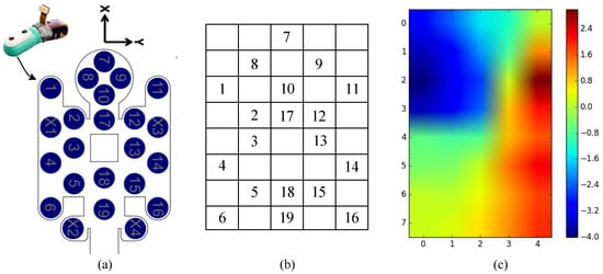 The definition of tactile image. (a) nineteen electrodes are distributed on the rigid core of the BioTac sensor; (b) the tactile image that consists of an matrix. The numbers denote the corresponding electrodes; (c) the tactile image after filling the empty pixels. The pixel value represents the electrode data.