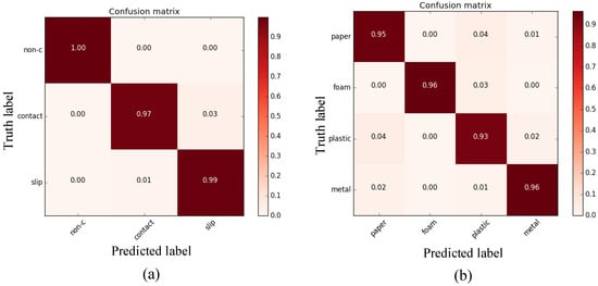 Two confusion matrices of slip detection (a) and material detection (b).