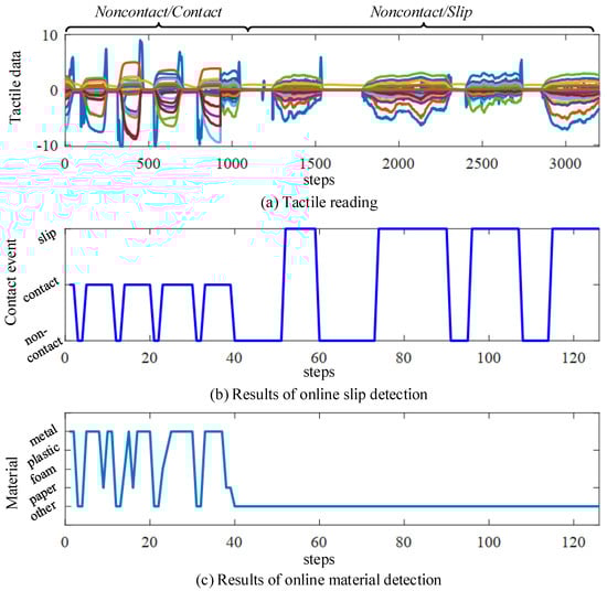 Examples of online slip detection and material detection using the tomato bottle. (a) the tactile reading is collected from the electrodes in the BioTac sensor. The first part of the tactile reading only consists of two contact events, i.e., non-contact and contact. The second part is slip or non-contact; (b,c) show the results of slip detection and material detection, respectively.