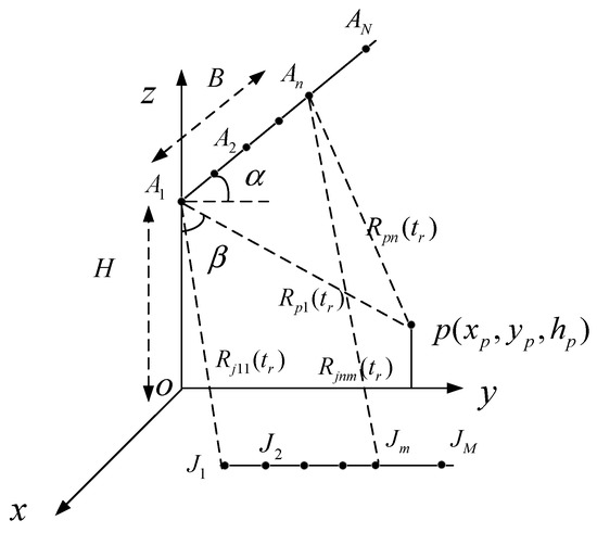 As shown in Figure 1, the multibaseline InSAR system works at the broadside mode with receiving antennas, where the antenna serves as the transmitter and all antennas receive the echoes simultaneously. The system is mounted on an airplane, which is flying at a constant velocity parallel to the positive x-axis at a height of . and denote the depression angle and the inclination of the baseline, respectively. represents the length of the baseline, which between and is , and between and is . Correspondingly, denotes as the length of the baseline between and . is a point in the three-dimension scene and its coordinate is shown by . denotes the instantaneous slant-range from the point to the antenna , where is the slow time. At , the antenna lies in the y–o–z plane and its coordinate is expressed as varying with . All transponders are placed parallel to the y-axis in the x–o–y plane with the same azimuth coordinate. is the instantaneous slant-range between the antenna and the transponder , where and serve as the index for each receiving antenna and each transponder, respectively.