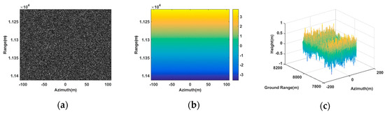 The program of the simulation experiments was written with the Matlab language and carried out in the Matlab 2016 environment. In the simulation, first, we simulated the jamming signals based on the proposed method and planted them in the background signals; and then, used the range-Doppler (RD) algorithm to obtain the SAR image of each antenna and operate image coregistration; next, after image coregistration, we extracted the phase interferogram corresponding to the baseline and carried out the phase unwrapping operation. Last, according to the absolute interferogram after unwrapped, we obtained the height of the false target. Besides, the jamming signal power to clutter signal power ratio (JCR) was 5 dB in the simulation experiments.