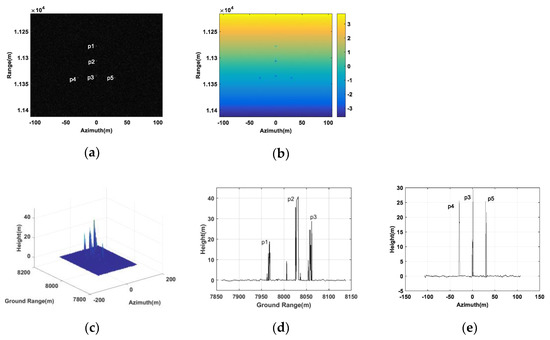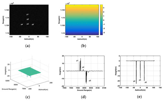 False point targets simulation based on three transponders. (a) SAR image in the antenna . (b) Absolute interferogram after unwrapped. (c) DEM of the false targets. (d) A slice graph of DEM of the false targets in ground range. (e) A slice graph of DEM of the false targets in azimuth.