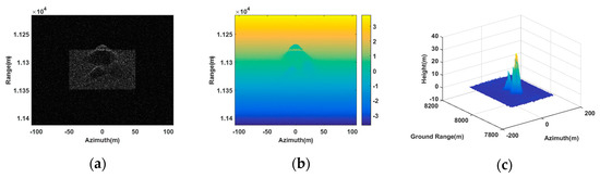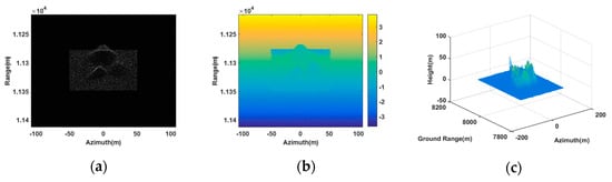Figure 6 is the imaging result of our proposed method using three synergetic transponders. From the SAR image of the antenna , as shown in Figure 6a, it can be seen that the generated scene was similar to the deceptive scene. The retrieval height of the deceptive scene shown in Figure 6c was also consistent with the deceptive template (as shown by Figure 5), where the maximum height was 34.63 m approaching the setting maximum value. Thus, our proposed method was valid in 3D deceptive scene generation.