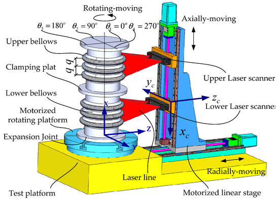 Non-contact methods include optical, electromagnetic, and acoustic measuring devices [5]. Optical measuring devices involve binocular vision, holographic interferometry, and laser triangulation. The laser triangulation method is widely applied for accurate measurement because of its high measurement accuracy, small size device, and fast measurement speed [6,7,8]. So, the laser scanning detection was applied to our system to obtain the outer contour data of the expansion joints of bellows.