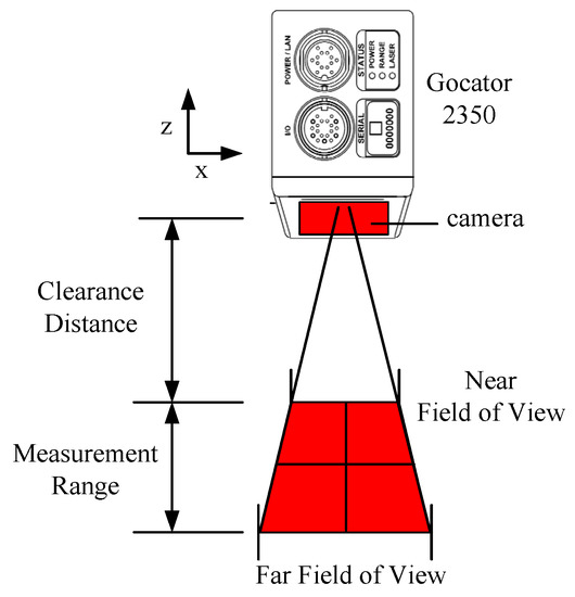 As shown in Figure 2, the resolution in the Z-axis direction of the scanner is between 0.019 and 0.060 mm, while in the X-axis direction, it is between 0.150 and 0.300 mm. The total number of single points that the scanner can collect in a single scan is 1280. The field-of-view (FOV) in the X direction is 158 to 365 mm and the measurement range is 400 mm. The clearance distance is 300 mm.