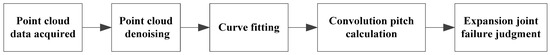 First, the outer contour of the bellows expansion joint is automatically scanned before and after the fatigue test. The point cloud data are then transferred to a computer terminal via Ethernet cable. Second, noise reduction is performed on the collected data to eliminate the influence of various noises on the measurement accuracy. The third step is to perform curve fitting on the processed point cloud data to facilitate the search for the peak points. The data of the convolution pitch of the bellows expansion joint is subsequently obtained via a peak-searching algorithm. By comparing the values of the pitch before and after the test, the convolution pitch changes can be seen more intuitively. Then, the condition and performance of the bellows expansion joints can be inferred via the data. Furthermore, the surface of the outer contour is reconstructed by processing the data. Figure 3 is the flowchart of the detection procedure.