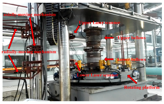 An experimental sample containing two bellows expansion joints produced by a pressure vessel manufacturer is shown in Figure 5. The equipment in the photo is an actual experimental device which includes two functions: Convolution pitch detection and fatigue testing. The bellows expansion joint was made of steel B315. The nominal diameter (DN) is 500 mm and the total height of the sample is 1500 mm. Each expansion joint has four convolutions and was placed on the rotating platform. When the expansion joint was rotated to a fixed angle, the laser scanner was triggered (by the rotary encoder) to scan the outer contour and obtain convolution pitch data. Then, tension and compression fatigue tests were conducted 3000 times with an internal pressure of 4.0 MPa and with an axial displacement of ±15 mm. After that, to obtain the convolution pitch deformation, the sample was measured by the scanner again.