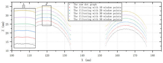 From the discussions of above, the denoising performance of the proposed method was evaluated on the point cloud data of bellows of different diameters. In order to find the appropriate number of window points and polynomial degrees, the window lengths were selected to be 10 points, 20 points, 30 points, 40 points, and 50 points, and the polynomial degrees were 2, 3, or 4, respectively. A large number of denoising tests were performed on the raw point cloud data of bellows of different specifications. Finally, it was found that when the number of window points is 40, a good noise reduction result can be obtained, and the polynomial degree has no obvious effect on denoising. To achieve a comparable compromise between the denoising effect and calculation time, the final selection of window number is 40, and the polynomial degree is 3. Figure 7 show the results of the standard S–G filtering with different numbers of window points, and the polynomial degree is 3. For easy comparison, the Z coordinates of the point cloud data were translated for different window lengths in Figure 7. Figure 8 is a display of two kinds of point graphs of a convolution in the same coordinate system: One is the raw dot graph and the other is a dot graph obtained after filtering using the S–G algorithm. The polynomial degree of the S–G algorithm is cubic and the window width is 40. It can be seen that the proposed method has less signal distortion after denoising and has visibly better smoothing performance. After denoising, the new point of the Z coordinate was obtained by fitting the curve while keeping the X coordinate unchanged, and the point cloud after noise reduction was obtained.