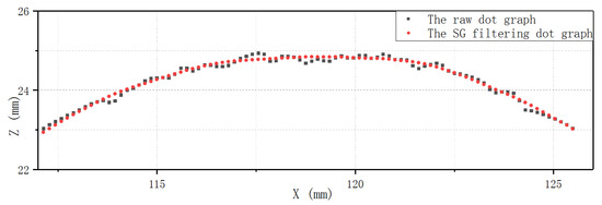 The statistical filter could effectively remove the outlier noise points of the 3D point cloud, which were mainly caused by the system noise or surface roughness [12]. However, this filtering method is not suitable for the 2D point cloud. The Savitzky–Golay (S–G) algorithm is one of the effective methods for noise reduction of electronic signals or vibration signals [13,14]. It is a novel method for random noise reduction, in which the S–G filter adopts piecewise weighted polynomials via least-squares estimation. Therefore, effective smoothing is achieved in extracting the original signal from the environmental noise while retaining the shape as closely as possible to the original one. In fact, the 2D point cloud data obtained from each line scanning can be regarded as electronic signals or vibration signals, the X coordinate corresponds to the time axis, the Z coordinate corresponds to the amplitude, the shape of the expansion joint is regarded as the original signal, and the outlier noise points are regarded as noise signals. Then, S–G filters can be used to eliminate the outlier noise points. A large number of subsequent tests have proven that this method has achieved appropriate results in noise reduction.