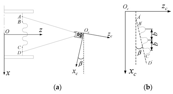 The installation errors are inevitable in an LSMS, which will affect subsequent convolution pitch detection. The installation errors are mainly generated during mounting of the bellows and the LLS. According to the principle of relative motion, both installation errors can be normalized to the LLS installation errors. The installation errors mainly refer to the fact that the zc-axis of the laser scanner and the x-axis of the bellows is not perpendicular, which will cause the most serious deviations in subsequent convolution pitch calculations. The installation errors are presented in Figure 9. Owing to the fact that the zc-axis of the laser scanner is not perpendicular to the x-axis of the bellows, shown in Figure 9a, the point cloud data obtained by scanning will be deflected, shown in Figure 9b. In order to reduce the deflection error, coordinate transformation should be performed, and the least squares method can be adopted.