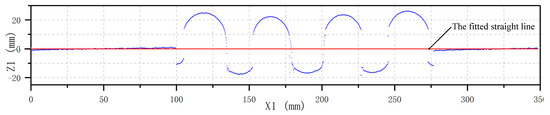 In order to get the convolution pitch value, the point cloud data need to be coordinate-transformed. The coordinate transformation consists of two basic transformations. The first step is a translation, that is, translating the fitted line along the Z-axis and passing the coordinate origin. The second step is the rotation, that is, rotating the line clockwise to coincide with the X-axis. The new point cloud coordinates after transformation can be obtained by Equation (9). Figure 10 is the result of coordinate transformation using the above method of Figure 6.