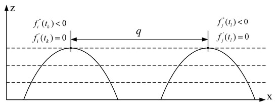 As shown in Figure 11, the convolution pitch q is equal to the absolute value of the X-coordinates subtracted from two adjacent convolutions peak points. As long as the X-coordinates of the convolutions peak points can be explored, the convolution pitch q can be obtained. There are many peak-searching algorithms with different application fields [18,19,20,21]; e.g., the direct peak-searching method, the Gauss product peak-searching method, and the second-order derivative-searching method. The peak point of the bellows expansion joint fitting curve met the condition that the first derivative was 0 and that the second derivative was negative, that is, and . Therefore, the second-order derivative searching method is adopted in this paper.