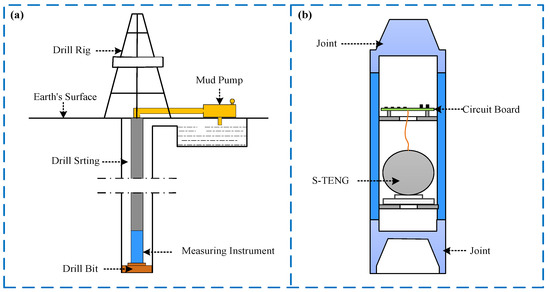 Installation location of the S-TENG (spherical triboelectric nanogenerator). (a) Installation location in the downhole; (b) Enlargement diagram of the measuring instrument.
