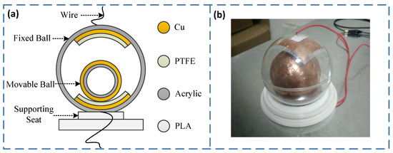 As shown in Figure 2, the S-TENG is composed of a fixed ball, a movable ball, and a supporting seat. The fixed ball is fixed on the supporting seat and keeps stationary with the supporting seat, and the movable ball is embedded in the fixed ball and can move freely. Cu (Copper) and PTFE (Polytetrafluoroethylene) are pasted on the upper and lower sections of the fixed ball. PTFE is used as a friction layer to generate electric charges, and Cu is used as an electrode to derive the electric charges generated by PTFE. Cu is also attached on the surface of the movable ball and is used as both the friction layer and the electrode.