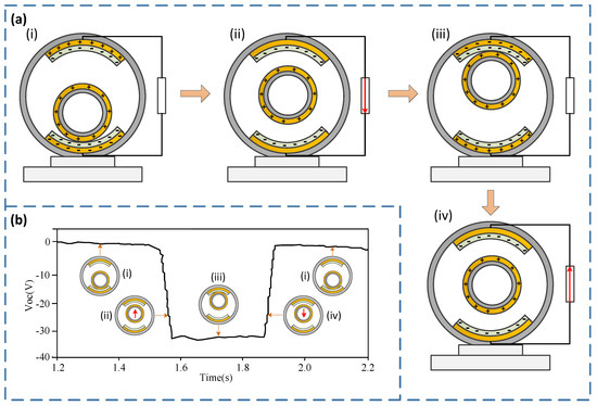 The movable ball can be precharged when the S-TENG works at least once. Figure 3a-i shows the initial state of the S-TENG. The movable ball is positively charged, and the fixed ball’s lower friction layer is negatively charged because the Cu is more likely to lose electrons than the PTFE [37] under the triboelectricity and electrostatic induction. Figure 3a-ii shows the state when the vibration occurs, and the movable ball moves upward to the middle position. At this stage, the electrons flow through the external load and form the electrical current. Figure 3a-iii shows the state when the movable ball contacts the upper friction layer of the fixed ball, and the upper friction is negatively charged due to the triboelectric and electrostatic induction. Figure 3a-iv shows the state when the movable ball moves downward to the middle position, and the electrons flow through the external load reversely and form a reverse current. Figure 3a-i shows the state when the movable ball falls to the initial position, and the charges are transferred to the lower friction layer, which returns to the initial state. During the working process of the S-TENG, the theoretical output voltage signal is shown in Figure 3b.