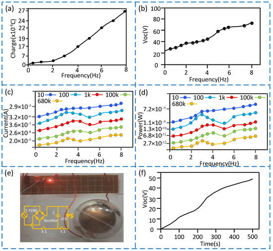 Test results of the S-TENG power generation performance. (a) Curve showing the variation of the transferred charges over the vibration frequency; (b) Curve showing the variation of the output voltage over the vibration frequency; (c) Curve showing the variation of the output current over the vibration frequency with different resistances; (d) Curve showing the variation of the output power over the vibration frequency with different resistances; (e) A picture showing the LED (light-emitting diode) lighted by the S-TENG; (f) charging curve of the capacitor (50 V, 2 μF) with the load resistance (1 k) in 8 Hz.