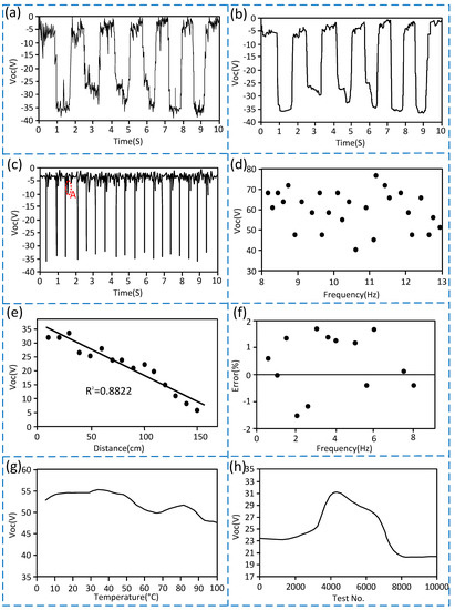 Test results of the S-TENG sensing performance. (a) Curve showing the output voltage of the S-TENG when the vibration frequency is 0.6 Hz (Unfiltered signal); (b) Curve showing the output voltage of the S-TENG when the vibration frequency is 0.6 Hz (Filtered Signal); (c) Curve showing the output voltage of the S-TENG when the vibration frequency is 1.8 Hz; (d) Scatter plot of output voltage of the S-TENG when vibration frequency exceeds 8 Hz; (e) Curve showing the variation of the output voltage over the distance from the vibration source when the vibration frequency is 2 Hz; (f) Measurement error scatter plot; (g) Curve showing the variation of the output voltage over the temperature when the vibration frequency is 4.5 Hz; (h) Curve showing the variation of the output voltage over the test times when the vibration frequency is 1 Hz.