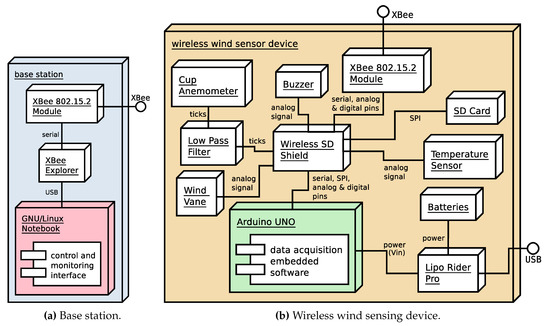 Figure 2a depicts the deployment diagram of the base station. From a hardware point of view, the base station is a computer running GNU/Linux with a USB adapter [49] to connect a XBee module for radio communications with the wind sensing devices (the notebook shown in Figure 3a). As explained previously, a convenient way to deploy the base station in a real data acquisition session environment is to use a Raspberry Pi-based embedded computer in combination with a tablet device to access its graphical interface via VNC (for purposes of clarity, this is not shown in the deployment diagram depicted in the figure). The XBee modules used at the base station and also at the wind sensing devices are XBee PRO S1 802.15.4 60 mW [50] modules with a line-of-sight reach of about 1.6 km. Bear in mind that, although initially the main requirement for the reach of the system was to cover an area of 50 × 50 square meters, XBee PRO S1 802.15.4 communication modules provide a longer reach, which allows the system to be deployed in wider areas. This is in contrast to other short-range wireless technologies, like Bluetooth, which despite providing higher data rates, have less reach and a higher power consumption [12,51,52,53].
