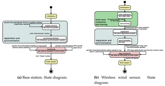 The diagrams in Figure 4a,b clarify the different states of the system during a data acquisition session. To start a measurement session, the control and monitoring interface must first be initiated in the base station. The interface, once initialized, waits for the wireless wind sensing devices to be registered (state register devices, Figure 4a).