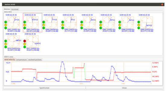 At the base station, for each registration packet which is received from each wind sensing device, the device is registered and appears on the visual control and monitoring interface (state register devices, Figure 4a). That is, as each device is deployed, installed and switched on, it appears on the base station interface. Once all the deployed devices have been registered (Figure 5 shows a snapshot of the interface with several devices already registered), we can make the system start acquiring data by clicking on the synchronization button of the interface. By doing so, the base station broadcasts a synchronization packet (state synchronize devices, Figure 4a), and then passes to a state of monitoring and control of the registered wind sensing devices while they acquire data (state monitoring, Figure 4a). The wind sensor devices, once they receive the synchronization packet broadcast by the base station, synchronize their internal time with the packet and start measuring (state data acquisition, Figure 4b).