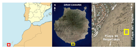 The Maspalomas transgressive [70] dune field is located in the southern vertex of Gran Canaria (Canary Islands, Spain) (Figure 8), on an alluvial plain composed of marine and terrestrial sedimentary deposits whose origin has been dated to the Quaternary [71,72]. The Maspalomas dune field is covered by moderately well classified and symmetric fine sands, although with some tendency to negative asymmetries. The granulometric distribution is clearly unimodal, which confirms the aeolian character of these materials [73].