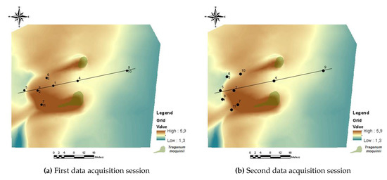 For this experimental study, an area was selected in the mid-zone of the dune system, highlighted in the right-hand side image of Figure 8, and shown in more detail in Figure 9. Two experimental sessions were carried out the same day. Firstly, a topographical survey was developed using a total station. Then, wind data (speed and direction) were collected using the DIY data acquisition system described in the previous section, namely the eleven wireless wind sensing devices built and developed specifically for the task. The selected plot covered 1782.8 square meters and was chosen for the following reasons. First, given what has happened in the central sector, the northern and southern dunes have been severely affected by tourism development [43,47]. Second, the plot is located sufficiently far from the tourist areas and the zones used for sunbeds and parasols to minimize the risk of interaction with anthropic activities during the experiments. Third, the main interest of this experimental analysis was to analyse the formation of tongue dunes in this natural environment, a type of dune formed between two nebkhas identified in a previous study [44,46] in the same area.