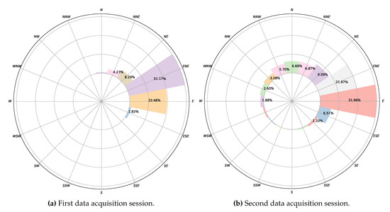 Second data acquisition session. Time period: 1:00 p.m.–4:38 p.m. Ten sensors were used in this experimental session (eleven sensors were used, but sensor 10 malfunctioned during this session and so has been omitted). (a,b) show respectively the histograms of wind speed and direction acquired by each sensor during the experiment. Each histogram line represents the fraction of measurements in a discrete interval or bin of speeds and angles respectively. Bins are evenly spaced and have the same width.