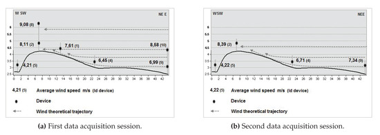 As to the power autonomy of each wind sensing device, we experimentally determined an autonomy of slightly more than 30 h with fully charged batteries. This is well above the 8–10 h maximum duration of the experimental sessions with the wind data acquisition system. In any case, if necessary, the Lipo Rider Pro supply/charging board, integrated in each device, allows the batteries to be charged with a solar panel in the range of 4.8–6.5 v. and 400–600 mA.