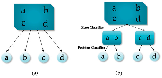 Hierarchical classification refers to that the RPs are successively classified at various levels of a defined dendrogram [26]. Figure 1b gives an example, where again a, b, c and d are RPs. As we can see, the input consisting of RSS measurements from four RPs is first assigned into one of two zones, namely {a, b} and {c, d}, at the first level, and then within that zone, a RP location is output as the final localization result. In hierarchical classification, two different kinds of classifiers need to trained. Firstly, the “zone classifiers” are in charge of deciding the most likely zone that the object belongs to. Secondly, the “position classifiers” are in charge of determining the specific RP where the object is located at. The hierarchical classification follows the well-known divide-and-conquer (DAC) principle, which aims at decomposing the input space into several subspaces to enhance the learning and generalization capability. In the indoor localization problem, the hierarchy concept can be instantiated by dividing the indoor environment into several zones. Further division within zones can be applied if applicable. The hierarchical classification reduces the number of considered RPs when classifying a new measurement, thus reducing the running time as well. Therefore, for large environments or scenarios with a large number of RPs, hierarchical classification is preferred. In the next section, we shall review some previous studies on hierarchical indoor localization.
