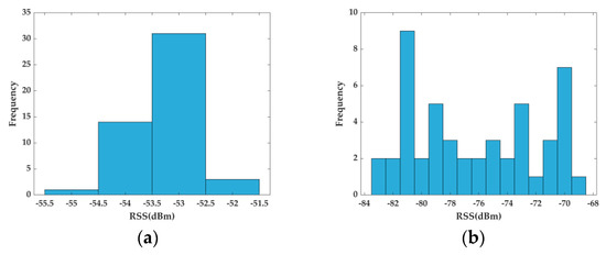 Histograms of 50 RSS samples collected at two different RPs: (a) RSS measurements are clustered and span a small range and it is reasonable to characterize this RP by RSS mean value; (b) RSS measurements spread a wider range and appear to have multiple model distribution and it is not reliable to characterize this RP by RSS mean value.