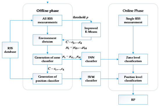 In this section, we present a new hierarchical classification framework for Wi-Fi RSS-based indoor positioning, which again contains the offline training phase and online localization phase. The block diagram of the entire system is shown in Figure 3. For the offline phase, we propose an improved K-Means algorithm to cluster RPs. The RPs are allowed to be included in more than one clusters, i.e., the obtained clusters can overlap with one another. We then train the 1NN method as the zone classifier and SVMs as the RP position classifier. On the localization stage, newly received RSS measurements are input into the hierarchical localization system to generate the online positioning result.