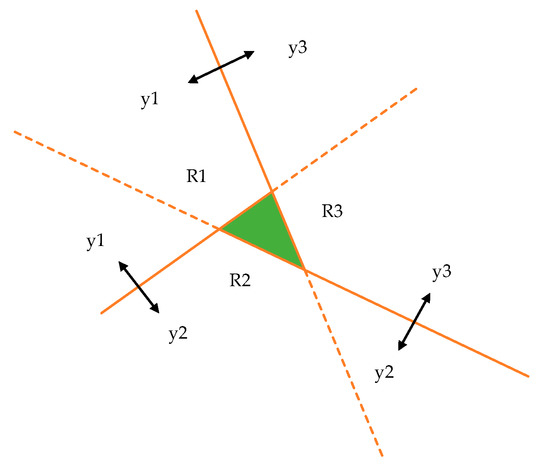 Ambiguities in the one-versus-one approach. The green area represents the ambiguous part.