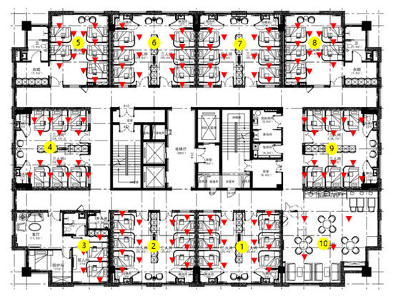 The schematic diagram of the test environment, where the rooms and RPs are labeled with yellow circles and red triangles, respectively.