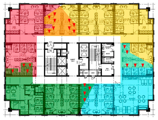Since the experimental environment is a rectangle and 4 Wi-Fi APs have been installed priorly, it can be naturally divided into 4 parts, which makes our choice of in Algorithm 1 to be 4. Results of the improved K-Means clustering method are depicted in Figure 7, where four zones are depicted in red, yellow, green and blue. The soft labelling nature of our algorithm is reflected by the existence of 4 overlapped areas with 22 RPs, which reduces the difficulty of zone classification and propagates more information rather than errors to the position classification level.