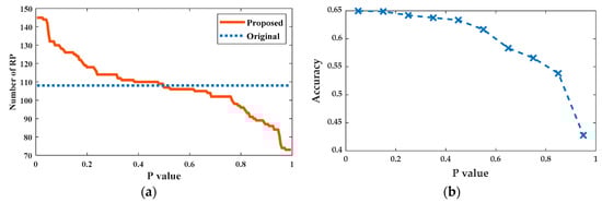 Figure 8a plots the total number of RPs in the four formed zones as a function of . When is small, the total number of RPs in four generated zones would be larger than the true RP number because the RPs in the overlap regions are counted more than once. With the increase of , more RPs become left out, and the total number of RPs in the four zones decreases accordingly. When is greater than 0.5, the total number of RPs in the four zones is less than the number of original RPs, indicating that there must be some RPs not assigned to any zones.