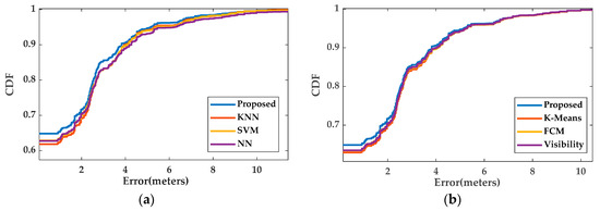 In Figure 9, the cumulative probability distributions (CDFs) of the positioning errors from the benchmark methods and the proposed technique are depicted. Note that the values of the CDF curves at the positioning error of 0m correspond to the position classification accuracy. Again, the enhanced localization performance of the proposed algorithm over the existing techniques is evident.
