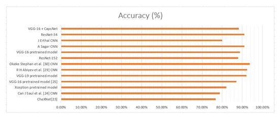 A comparative study performed in [20] and works done in [21] (such as the ones that used Self Organizing Maps (SOM) (This research was performed by Moh’d Rasoul, A and Dorgham, O and Razouq, Rami Salim in work “Pneumonia identification using organizing map algorithm” in 2006.) and Fuzzy C-Means) had been performed for finding the optimal model for detecting pneumonia. The algorithms both have pretrained weights (from datasets such as ImageNet [22]) and are user-defined, and have also been extensively used for detecting pneumonia. This can be inferred from the works done by Pranav Rajpura et al. [23] and Can J Saul et al. [24]. CheXNet, introduced in the former work, utilized 121 layer CNN that had been trained on ChestX–ray14. Despite the algorithm providing a relatively low accuracy of approximately 76.80% for predicting pneumonia, it had been able to classify 13 other chest diseases from CXR images. The latter researchers proposed a CNN architecture for early diagnosis of pneumonia and achieved an accuracy of 78.73% with a much simpler architecture. Apart from these studies, there have been works [25,26] that utilized Xception, VGG16, and VGG19 models [27,28] that were pretrained on the ImageNet dataset. These works managed to achieve an accuracy of 82% for the Xception pretrained model, 87% for the VGG16 model, and 92% for the VGG19 model. The authors of [29] compared the proposed CNN model architecture with algorithms such as Backpropagation Neural Networks (BPNN), Competitive Neural Networks (CpNN), and pretrained and fine-tuned networks (like VGG16 and VGG19). Later, Okeke Stephan et al. [30] succeeded in achieving a validation accuracy of 93.73% for similar classification with the usage of a user-defined CNN architecture.