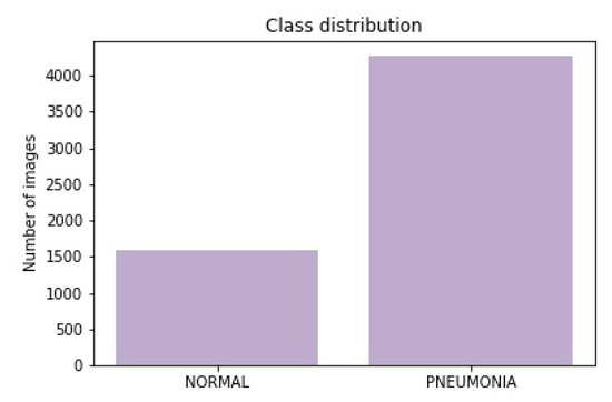 The dataset consists of CXR images that were taken from the Mendeley CXR image dataset [31]. This dataset consists of 5857 CXR images. These have been divided into 2 classes—“Normal” and “Pneumonia”. The distribution (i.e., classes and training, validation, and testing set) for these images has been depicted below in Table 2, whereas the class distribution of the dataset has been shown in Figure 3.