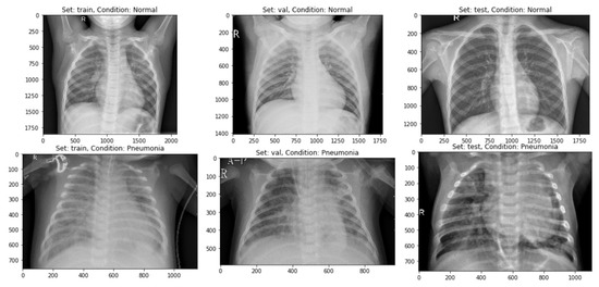 This depicts that there were 1583 images for the “Normal” class and 4274 images for class “Pneumonia”. This depicts that ~27% of the data had been represented through “Normal” class, whereas ~63% of the CXR images had “Pneumonia”. As the CXR images can be sensitive to slight changes in shearing, rotation, or zooming, data augmentation had been avoided in the CXR image dataset. Therefore, the data could not be undersampled or oversampled. The sample of images for each of the sets has been displayed below as in Figure 4.