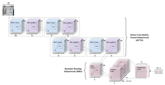 The second model—integration of convolutions with capsules (ICC), depicted in Figure 6—used for detecting pneumonia, is a combination of convolutions with capsule layers among which (simple capsules at the bottom of Figure 6), the routing occurs. This network has two subnetworks—the dense convolution neural subnetwork (or also known as dCNS) and the dynamic routing subnetwork (or also known as DRS).