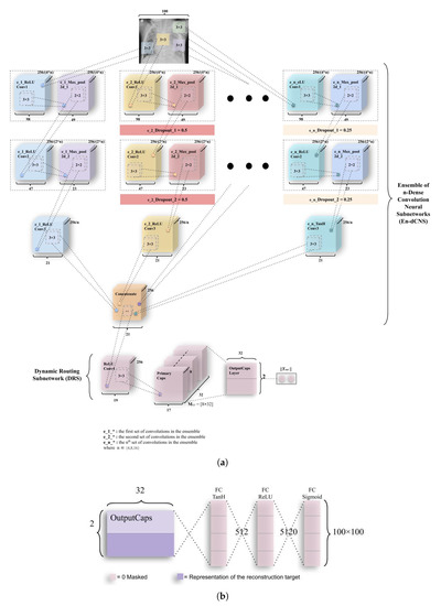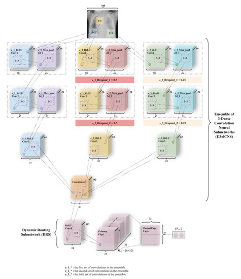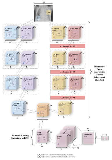 The third and the final model—Ensemble of convolutions with capsules (ECCs) presented in Figure 7—is a combination of ensemble of convolutions. This network also has two subnetworks—the ensemble dense convolution neural subnetwork (known as EdCNS) and the dynamic routing subnetwork (known as DRS).