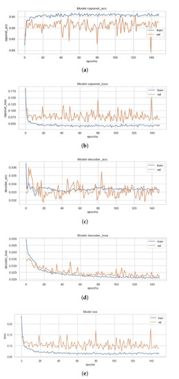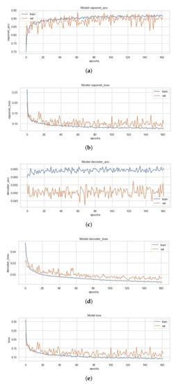 All three models and the four variants of the ECC (i.e., the EnCC models) discussed above had been trained on a set of 4100 images, validated on 879 images and had been tested with 878 images. Figure 10 represents the training curves for the simple CapsNet. These figures are representative of the CapsNet accuracy, CapsNet loss, Decoder accuracy (As discussed earlier, the decoder is not able to generate back the images (signified by the low decoder accuracy and loss in Figure 10c,d that it got due to vector mapping limitations, there are only three plots (one for each Simple CapsNet, ICC and ECC) representing the training of decoder.), Decoder loss, and the total loss (sum of all losses) from Figure 10a–e) for simple CapsNet, in order. All these figures had been created using the history of training from simple CapsNet. The packages used were Matplotlib [38], Keras [39], and Seaborn. This model converged after 161 epochs and had CapsNet validation accuracy of 93.75% (therefore being comparable to model in [30]). The other values have also been listed in Table 3 below.