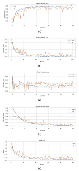 Figure 11 represents the training curves for the ICC model described earlier. These figures are representative of the CapsNet accuracy, CapsNet (Note that the CapsNet accuracy and all other terms mentioned here have CapsNet, because the whole architecture having capsule layers is usually divided into 2 different networks which can help encoding of data through activity instantiation vector. Therefore, “simple CapsNet” discussed above and the “CapsNet accuracy” discussed here and later onwards does not refer to the first model’s accuracy. Rather it is the accuracy of the discriminative model, and term “Decoder accuracy” is generative model’s accuracy.) loss, Decoder accuracy, Decoder loss, and the total loss (sum of all losses) from Figure 11a–e for the ICC model, in order. All these figures had been created using the history of training from ICC. This model converged after 100 epochs and had CapsNet validation accuracy of 95.22%. The other values have also been listed in Table 3. These 128 feature maps of convoluted images are then reconstructed through the capsule layers, which when compared to the input image (pixel-wise) has 33.34% (decoder accuracy) similarity as the feature maps of convoluted images are of dimensions 8 × 8.
