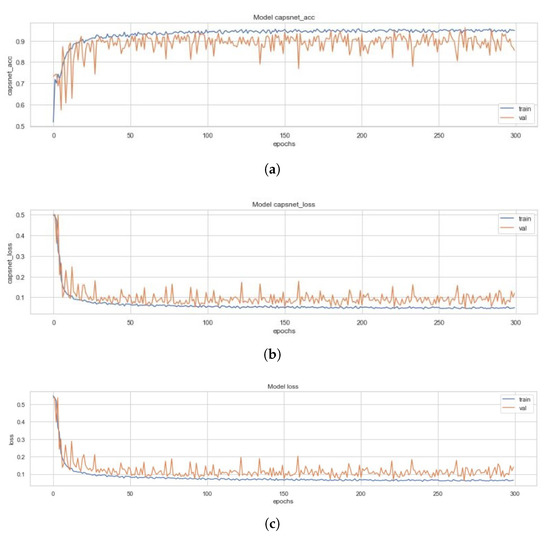 (a) Validation (in orange) and Training Accuracy (in blue) during the training of E16CC model’s CapsNet. (b) Validation (in orange) and Training Loss (in blue) during the training of E16CC model’s CapsNet. (c) Validation (in orange) and Training Loss (in blue) during the training of E16CC model’s CapsNet + Decoder.